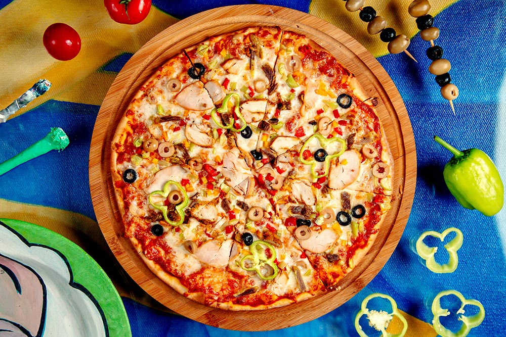 Blat pizza, sos rosii, mozzarela, sunca pui, ciuperci, masline, anghinare, porumb, rosii